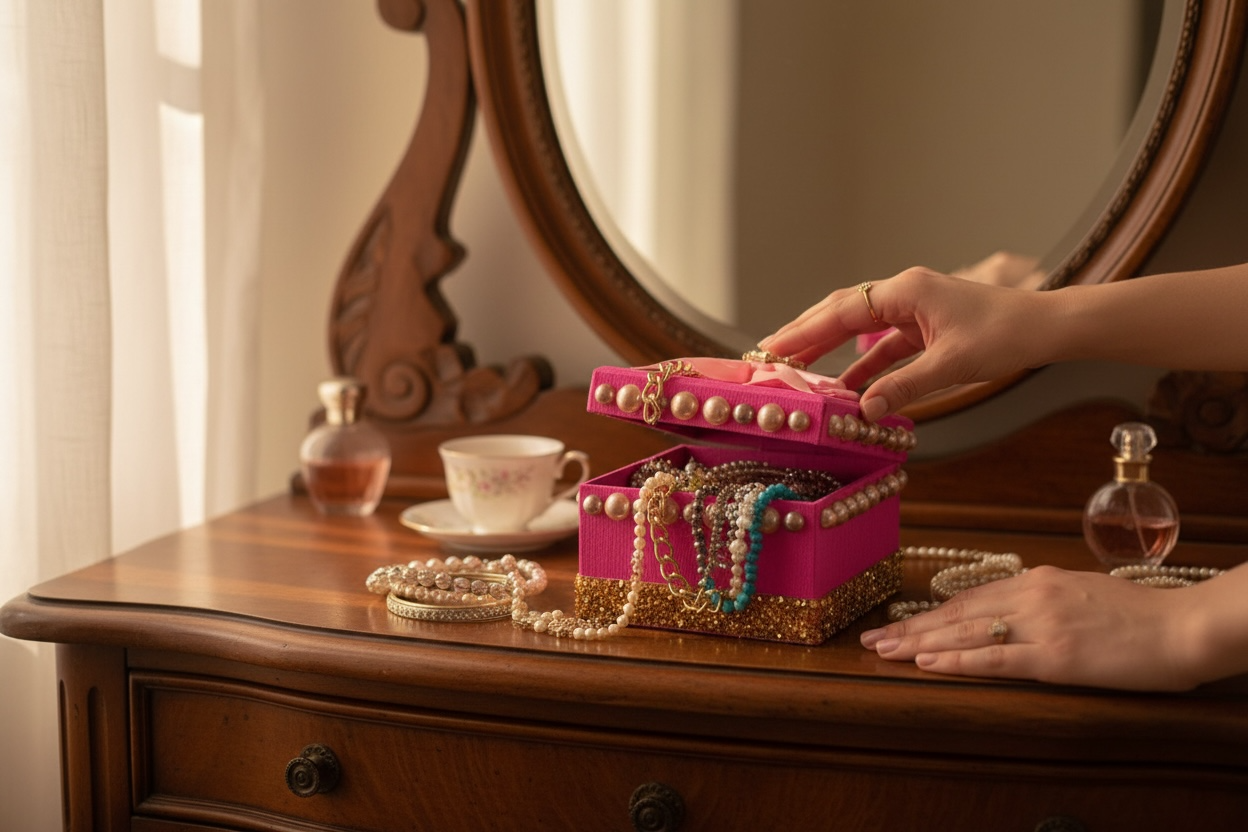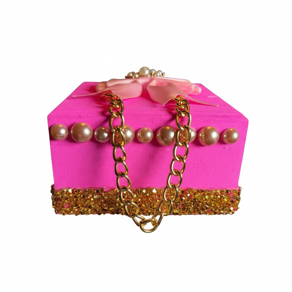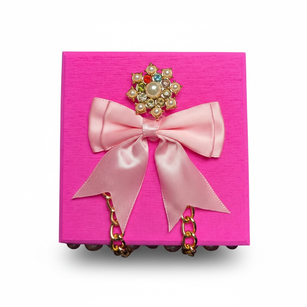 Add a pop of glam to any space with this hand‑decorated pink junk box, perfect for holding your favorite small items, jewelry, hair accessories, or desk essentials. Each box is adorned with pearl accents, a gold‑tone chain detail, sparkling rhinestones, and a soft ribbon bow for a luxe, girly look. Every junk box is handmade, so colors, embellishments, and layouts will vary, making each piece one‑of‑a‑kind.