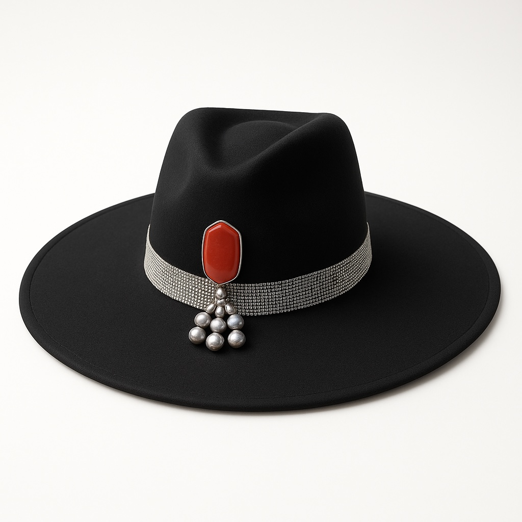 Make a bold statement with our handcrafted Fedora Hat – designed with a wide brim, sleek shape, and finished with dazzling embellishments that set it apart from the rest. Each hat is uniquely styled with gemstone or pearl accents, making it truly one of a kind.